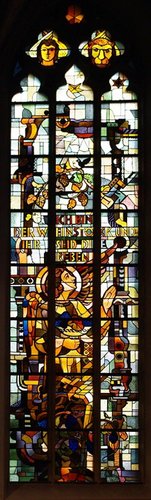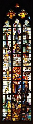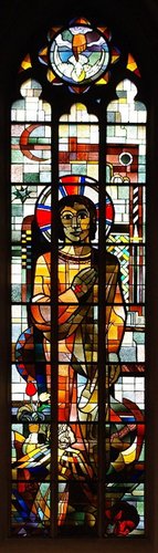 Im mittleren Fenster steht der auferstandene Christus, der jeden mit großen Augen so anschaut, als ob er mit ihm sprechen möchte. Er streckt seine rechte Hand mit dem Wundmal der Kreuzigung vor, wie es Jesus nach dem Johannesevangelium (Joh 20,19ff) acht Tage nach seiner Auferstehung tat und dabei zum Apostel Thomas sprach: „ … sieh meine Hände … und sei nicht ungläubig, sondern gläubig.“ Können wir Christus eine bessere Antwort geben als Thomas, der ausrief: „Mein Herr und mein Gott!“? Im unteren Teil des Chorfensters wird der Auferstandene von einem Engel angebetet, rechts unten verkriecht sich der Teufel in Tiergestalt. Christus Haupt ist umgeben von einem Glorienschein mit einem eingeschriebenen Kreuz.