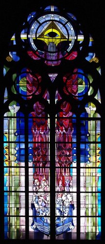 Das Fenster im südlichen Kreuzarm ist dem Sakrament der Firmung und dem Thema Pfingsten gewidmet. Im Maßwerk sehen wir als Darstellung der Dreifaltigkeit ein Dreieck mit dem Auge Gottes und mit der Taube des Heiligen Geistes. Von oben kommen dann zwei rotfarbene Ströme, die sich auf ein mit vielen Menschen besetztes Schiff ergießen, das „das Schiff Kirche“ bedeutet. Der Künstler Herb Schiffer (* 1936) wollte mit diesem Bild nicht das historische Pfingstwunder darstellen, sondern eher die Bitte um Aussendung des Heiligen Geistes. Überhaupt ist das Bild durch den Künstler als eine nachdenkliche Darstellung zum Thema Pfingsten ausgelegt; so finden sich unter den Menschen im Schiff zum Beispiel auch ein Soldat und ein Bischof mit abwehrenden Handbewegungen.