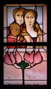 Wenn wir den Rundgang fortsetzen und am Nebeneingang der Südseite vorbei zum Haupteingang hinüber gehen, sehen wir links des Windfangs eine Nische in der Westseite des Kirchenschiffes mit dem „Maria-Hilf-Altar“. Das dort erkennbare Fenster gehört – da es vom Format her ganz aus der Reihe fällt – indes nicht in den Fensterzyklus der „Acht Seligkeiten“.