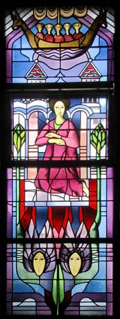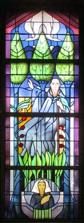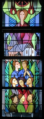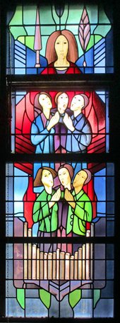 Die hl. Cäcilia als Patronin der Kirchenmusik und der Kirchenchöre. Das Fenster zeigt im unteren Teil eine Orgel, das eigentliche Instrument für den Gottesdienst. Darüber sind die Sänger des Chores dargestellt. Über ihnen erscheint Cäcilia im roten Mantel (Hinweis auf ihr Martyrium). Die Palme ist Zeichen des Martyriums, das Schwert deutet die Art ihrer Hinrichtung an.