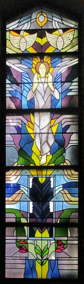 Der Auferstandene (zum Himmel Auffahrende) ist mit segnenden Händen dargestellt. Dass ihn sein Weg in die Herrlichkeit Gottes führt, ist angedeutet durch geflügelte Engelsköpfe, die man als Cherubim deuten kann. Auch der gelbe Kreis in der Spitze des Fensters mag auf die Vollkommenheit Gottes hinweisen. Die Botschaft von der Auferstehung kann nur als Offenbahrung Gottes angenommen werden. Deshalb erscheinen auch am leeren Grab, als welches man das dunkel ausgefüllte Rechteck in den beiden unteren Feldern des Fensters deuten kann, vier Engel (d. h. Boten) Gottes. Dass am Grab Christi Blumen blühen, zeigt an, dass von diesem Grab nicht der dumpfe Geruch von Moder und Tod ausgeht, sondern der Duft des Lebens.