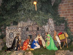 Wer genau hinsieht, kann es erkennen: In unserer Krippe hängt ein Kreuz!? - Natürlich, im Stall in Bethlehem hing kein Kruzifix. Aber wer genau „hinsieht“, kann es erkennen: Das, was wir feiern, hat etwas mit dem Kreuz zu tun, so wie Jesus aus Nazareth nur von seinem Kreuz her zu verstehen ist. Wie bei einer Holzscheibe liegt hier das Zentrum, um das sich alles weitere bildet. Wie wir Jesus Christus erst vom Ende seines Lebens her verstehen können, so fügt sich auch unser aller Leben erst aus einer anderen Perspektive zu einem Ganzen - aus der Perspektive Gottes, der jenen Jesus aus Nazareth weder in der Krippe noch am Kreuz zugrunde gehen ließ, sondern ihm neues Leben schenkte.