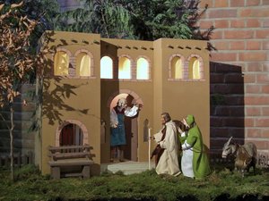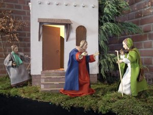 Die letzte adventliche Szene, unmittelbar die weihnachtlichen Szenen vorbereitend, ist der Herbergssuche gewidmet. Maria und Josef sind in Bethlehem angekommen, doch heftig gestikulierend wehrt der Wirt, der sich im Eingang seiner Herberge aufgebaut hat, den demütig um Unterkunft bittenden Josef und die hochschwangere Maria ab. „... und sie gebar ihren Sohn, den Erstgeborenen. Sie wickelte ihn in Windeln und legte ihn in eine Krippe, weil in der Herberge kein Platz für sie war.“ Vor der verschlossenen Herberge bereits muss der noch ungeborene Sohn Gottes erfahren, was der Evangelist Johannes in seinem Prolog beschreibt: „Er kam in sein Eigentum, aber die Seinen nahmen ihn nicht auf.“