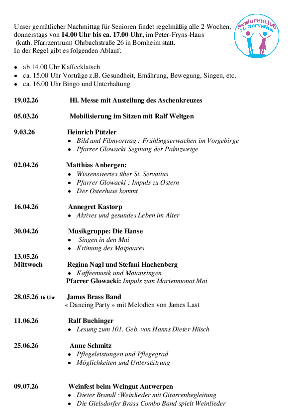Das Programm und alle Termine der Seniorennachmittage werden in den 2- wöchentlichen Pfarrnachrichten auf der Website von baruv.de. im Eingangsbereich der Kirche St. Servatius im Pfarrbrief und in der örtlichen Presse veröffentlicht.